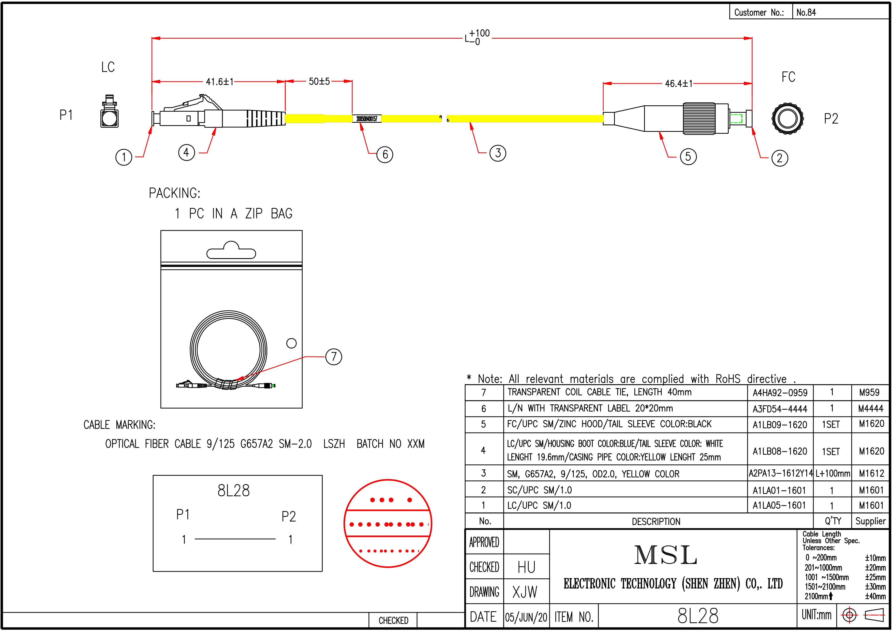 | Wire specification | SM,G657A2,9/125,0D2.0,YELLOW COLOR |