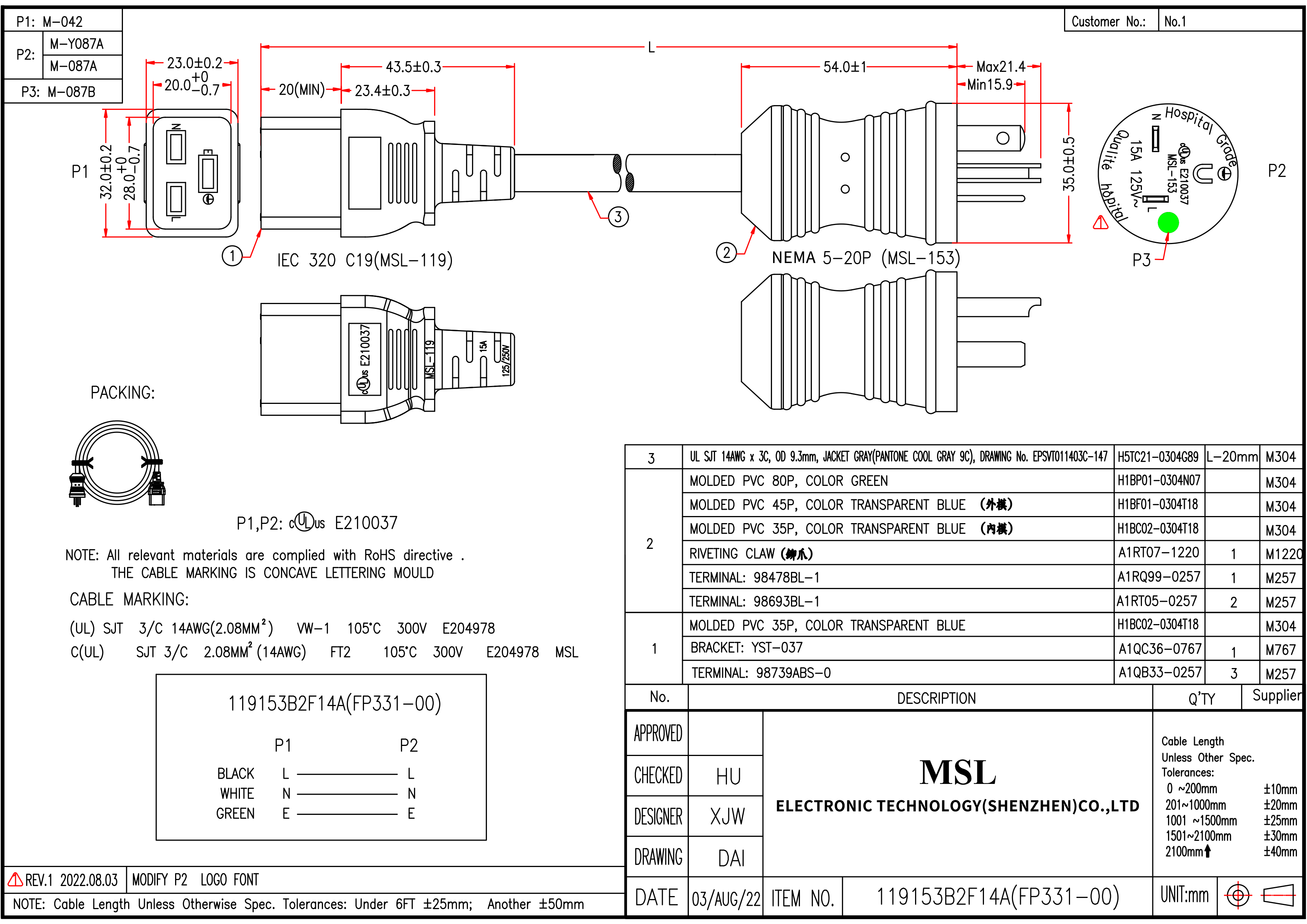 | Wire specification | UL SJT 14AWG x 3C, OD 9.3mm, JACKET GRAY(PANTONE COOL GRAY 9C), DRAWING No. EPSVT011403C-147 |