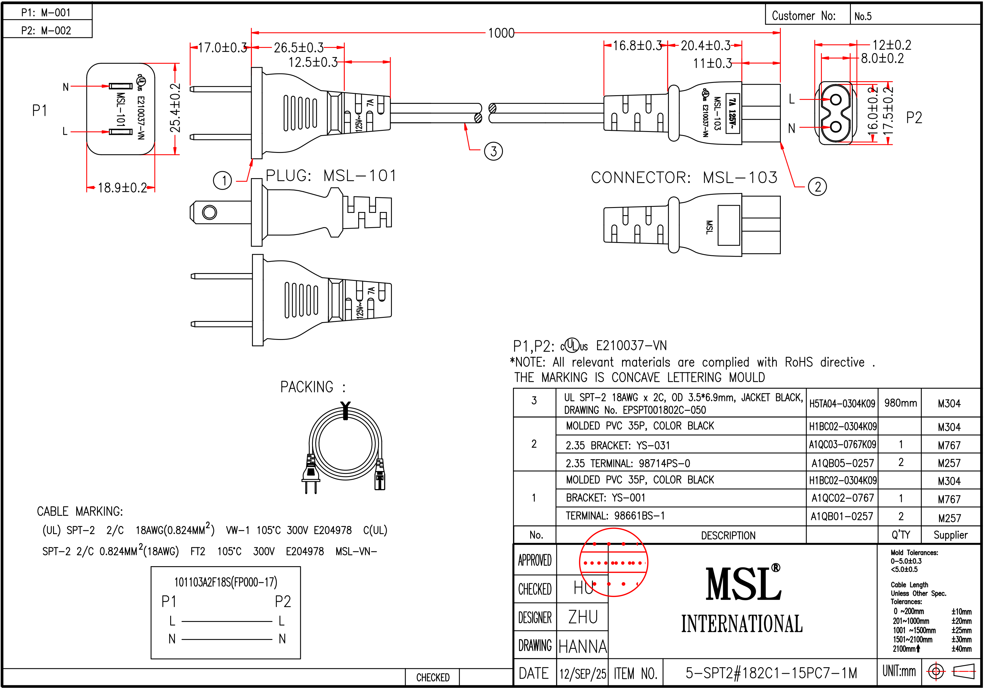 | Wire specification | UL SPT-2 18AWG x 2C, 0D 3.5*6.9mm, JACKET BLACK, DRAWING No. EPSPT001802C-050 |