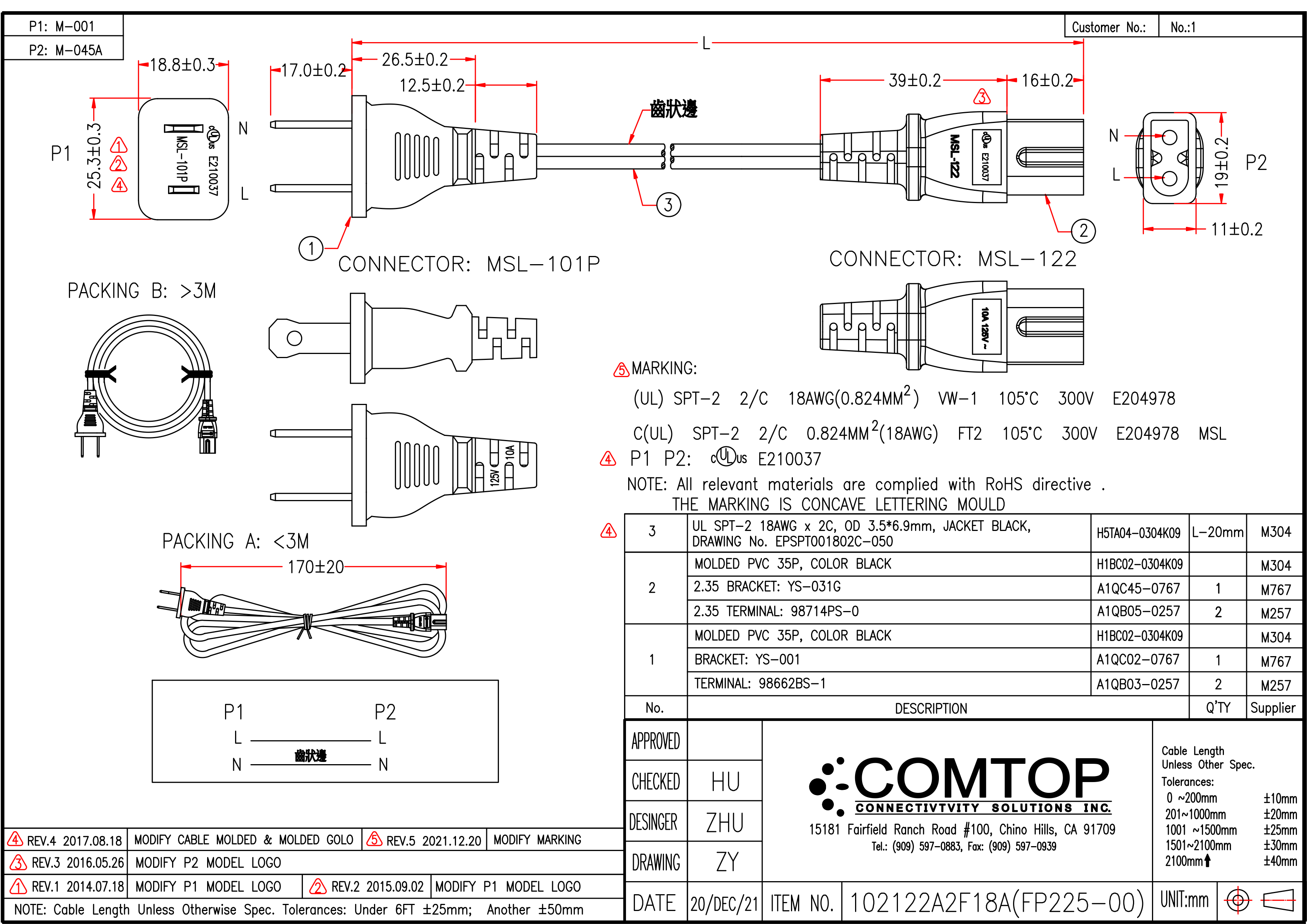 | Wire specification | ULSPT-2 #18 2C OD3.5*6.9 ( EPSPT001802C-014) |